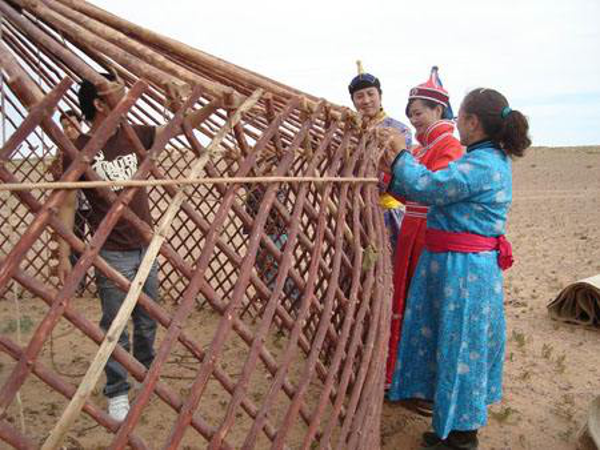 捆繩墜繩。捆繩是把相鄰兩片哈納的口綁在一起,使其變成一個整體的細繩,用駱駝膝蓋上的毛和馬鬃馬尾搓成。墜繩是套瑙最高點拉下的繩子。蒙古人對這根帶子分外看重,用公駝和公馬的膝毛或鬃尾搓成。大風(fēng)起時把墜繩拉緊,可以防止大風(fēng)灌進來把氈房吹走。