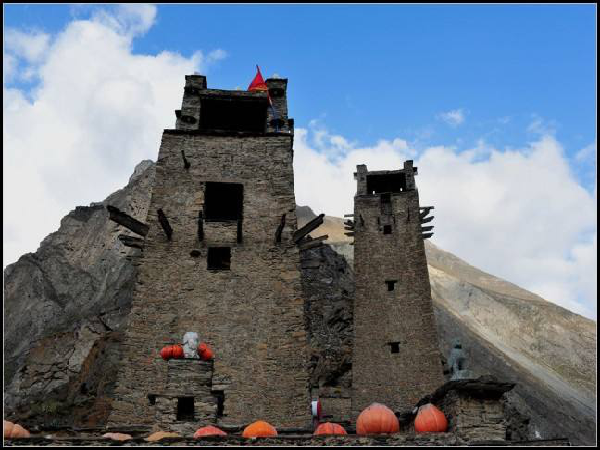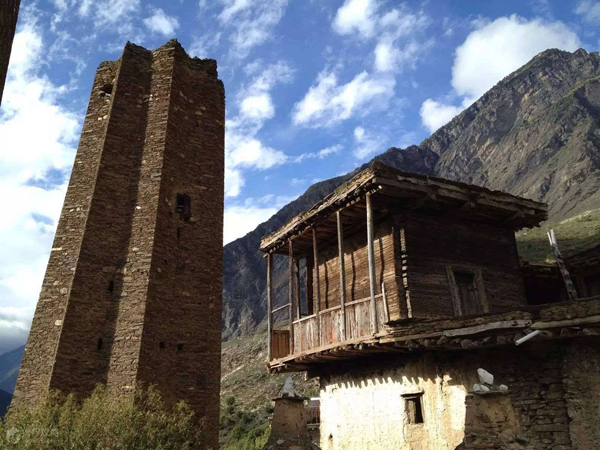 在羌語中,碉樓被稱為“邛籠”,意為美麗、高貴的房子,早在2000年前《后漢書·西南夷傳》就有羌族人“依山居止,壘石為屋,高者至十余丈”的記載。碉樓的高度在十米至三十米之間,用于御敵、貯存糧食和柴草。碉樓有四角、六角、八角幾形式,有的高達(dá)十三四層。建筑材料是石片和黃泥土,墻基深1.35米,以石片砌成。石墻內(nèi)側(cè)與地面垂直,外側(cè)由下而上向內(nèi)稍傾斜。修建時(shí)不繪圖、吊線、柱架支撐,全憑高超的技藝與經(jīng)驗(yàn)。建筑穩(wěn)固牢靠,經(jīng)久不衰。自唐朝來,羌族人民因各種原因向西北遷移,到了西藏和青海,所以現(xiàn)在,羌族碉樓也往往被稱為藏族碉樓。
