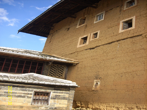 土樓和長城差不多,是用糯米、石灰、蛋清和泥土混合而成的外墻,內(nèi)部是用黃木和杉木,夏可抵暑氣,冬可抵冽風(fēng),還可自動調(diào)節(jié)室內(nèi)的溫度。