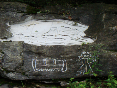 筆者在該村所見的具有“文化生態(tài)村”建設(shè)痕跡,除了村口巨石上鐫刻的文字外,還修建了一條貫通項(xiàng)目組專家們規(guī)劃的“文化生態(tài)展示區(qū)”的石板路,并在作為展示重要文化景觀的地方豎立了介紹或解釋性的文字標(biāo)牌。如,村口、山神廟前、摔跤場(chǎng)等都立有介紹的招牌。讓筆者疑惑和認(rèn)為不應(yīng)該“改造”的是在村民們的祖靈洞巖壁上的“藝術(shù)石刻”(見圖)。從筆者與村民的訪談和項(xiàng)目組的總結(jié)報(bào)告資料中,可以把文化生態(tài)村建設(shè)試點(diǎn)項(xiàng)目組在月湖開展的文化保護(hù)工作歸結(jié)為如下幾個(gè)方面: