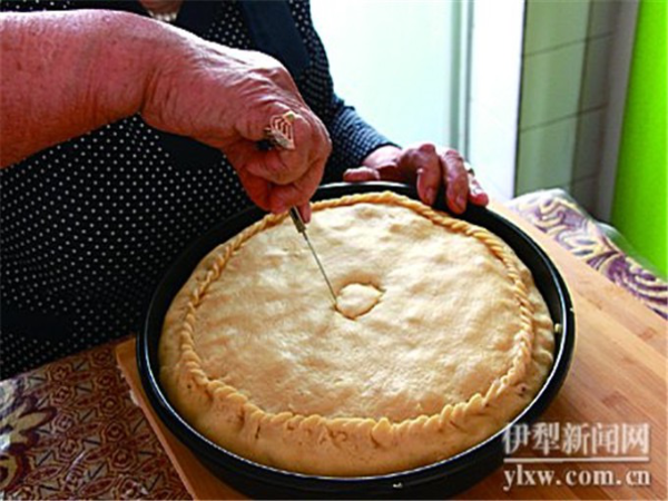 這段時間,就可以拌餡了。買斯胡旦向先前放在一旁的羊肉、土豆和洋蔥中加入一些鹽和黑胡椒粉,攪拌均勻。肉與黑胡椒粉相融的辛辣香味已經(jīng)開始漫溢。接著繼續(xù)揉面。將醒好的面分成大小兩塊。大的做底,小的做頂。待大小兩塊面都搟成圓形薄餅狀后,就將底子鋪在托盤底部,多出的部分緊緊扣合托盤邊緣。然后倒入餡料,鋪平,加蓋,將上下兩層面餅悉心捏合成好看的花邊。最后,在面餅中間掏個洞,切下的面團做成小壺蓋,再原位放到上面。壺蓋的作用在于等面餅烤至表層泛紅時,將其端出,取下壺蓋,加些許開水進去。“拜列西很厚,里面的料很多,要是水干了,就不容易熟?!辟I斯胡旦解釋。做完這一切,就可以將托盤放進烤箱了,調(diào)整烤箱至200℃的火力就夠,這樣,經(jīng)過2個小時的烘烤,外酥內(nèi)軟,香而不焦的拜列西就烤好了。