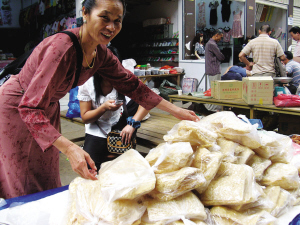 每天清晨,云南西雙版納傣族自治州景洪市嘎灑鎮(zhèn)集貿(mào)市場賣泡牛皮的傣族老咪濤(傣語意為“老阿媽”),都要忙得不亦樂乎。前來購買泡牛皮的餐廳老板絡(luò)繹不絕。因?yàn)榇黾遗菖Fど钍苋藗兊南矏郏陙?,隨著“傣家樂”餐廳如雨后春筍般崛起,賣泡牛皮的老咪濤生意越來越好。