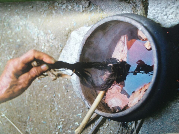 “織”是指使用踞腰織機,采用通經(jīng)斷緯的紡織方法織出各種花紋圖案,在織布時,先手工掛經(jīng),綁住藤或樹皮布腰帶,用腳踩織機的經(jīng)線木棍,席地而坐織布??椈ㄊ怯煤谏蛩{黑色做底線(經(jīng)線),根據(jù)圖案需要,將各種染色的線搭配,拉經(jīng)線、投緯線(彩色線),用木刀打緊緯線,織出各種花紋圖案。