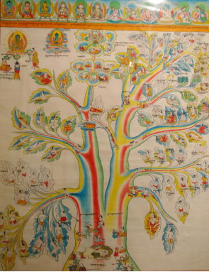 在上述80幅唐卡中:屬于藏醫(yī)學(xué)基礎(chǔ)理論方面,樹(shù)喻學(xué)說(shuō)見(jiàn)于唐卡(2)—(4)。唐卡(18)按照人體“龍”、“赤巴”、“培根”的“三大因素”學(xué),提出了它們是維持生命的物質(zhì)基礎(chǔ),人體平衡失調(diào)均可致病。