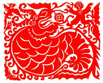 苗族民間剪紙的獨特之處還表現(xiàn)在構(gòu)思的新穎奇妙上。如《姜央兄妹合磨成親》圖,藝人為了擴大意境,打破了時間與空間的限制,把發(fā)生在不同時間與空間的事物描繪在一幅畫面上。作者大膽而巧妙地把畫面分成天空、山頂和山腳三部分,來表現(xiàn)三個不同的情節(jié)。天上飛的是蝴蝶和山雞,山頂上站著拍手叫好的姜央,山腳下站著姜央的妹妹以及已合上了的石磨,還有被從山頂上滾下來的石磨嚇驚了的野兔。這幅畫面生動形象地描繪了洪水泛濫后,地上的人都被淹死了,姜央和妹妹藏在葫蘆中幸免于難,為了繁衍人類,兄妹只好成親等情節(jié),非常巧妙地使這一遠古傳說得到精致的再現(xiàn)。又如三接式袖花剪紙圖案,畫面中間是雙象斗獸,上方是人馴蠶身龍,下面是龍象相爭,其余空處是魚鳥蟲蝶。這種奇特的構(gòu)思,把原始社會人與自然的關(guān)系表現(xiàn)得淋漓盡致。