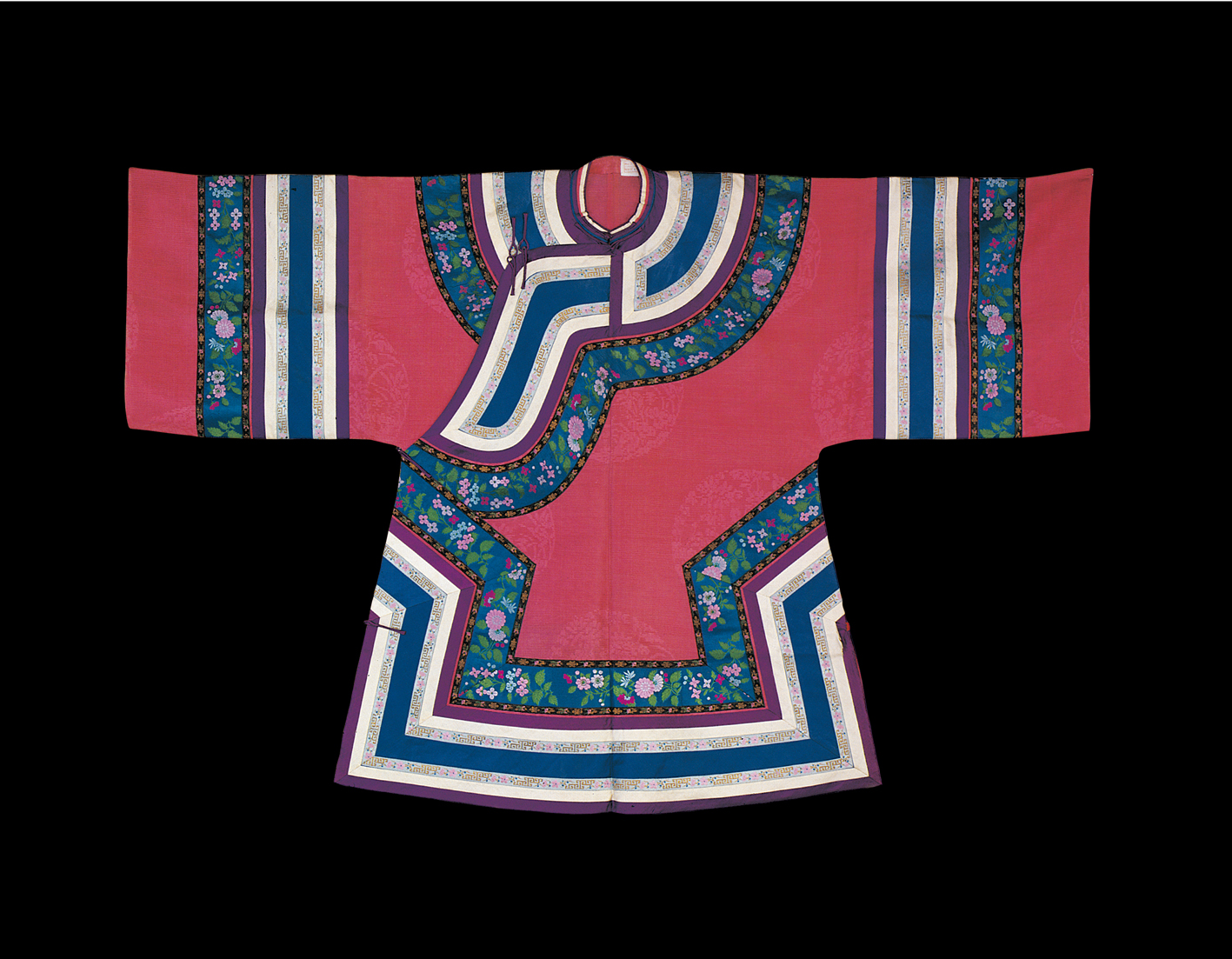元代,作為民族大融合和中外文化大交流時(shí)期,長(zhǎng)衣統(tǒng)稱(chēng)為袍,其樣式南北方差異不大,但材料貴賤精粗,卻差距懸殊。漢族男性發(fā)式變化不多,但北方的漢族女性發(fā)式較前簡(jiǎn)化。在元朝并沒(méi)有完整的冠服制度。蒙古人入主中原后仍保持其生活習(xí)俗,但同時(shí)又受漢族的影響,服飾日趨華麗。在大宴活動(dòng)中,天子百官要穿統(tǒng)一顏色的服裝,稱(chēng)為“質(zhì)孫服”,其形為袍襖狀,與漢族深衣相近(圖為漢族清代牡丹紋緞繡女裝,中央民族大學(xué)民族博物館館藏)。