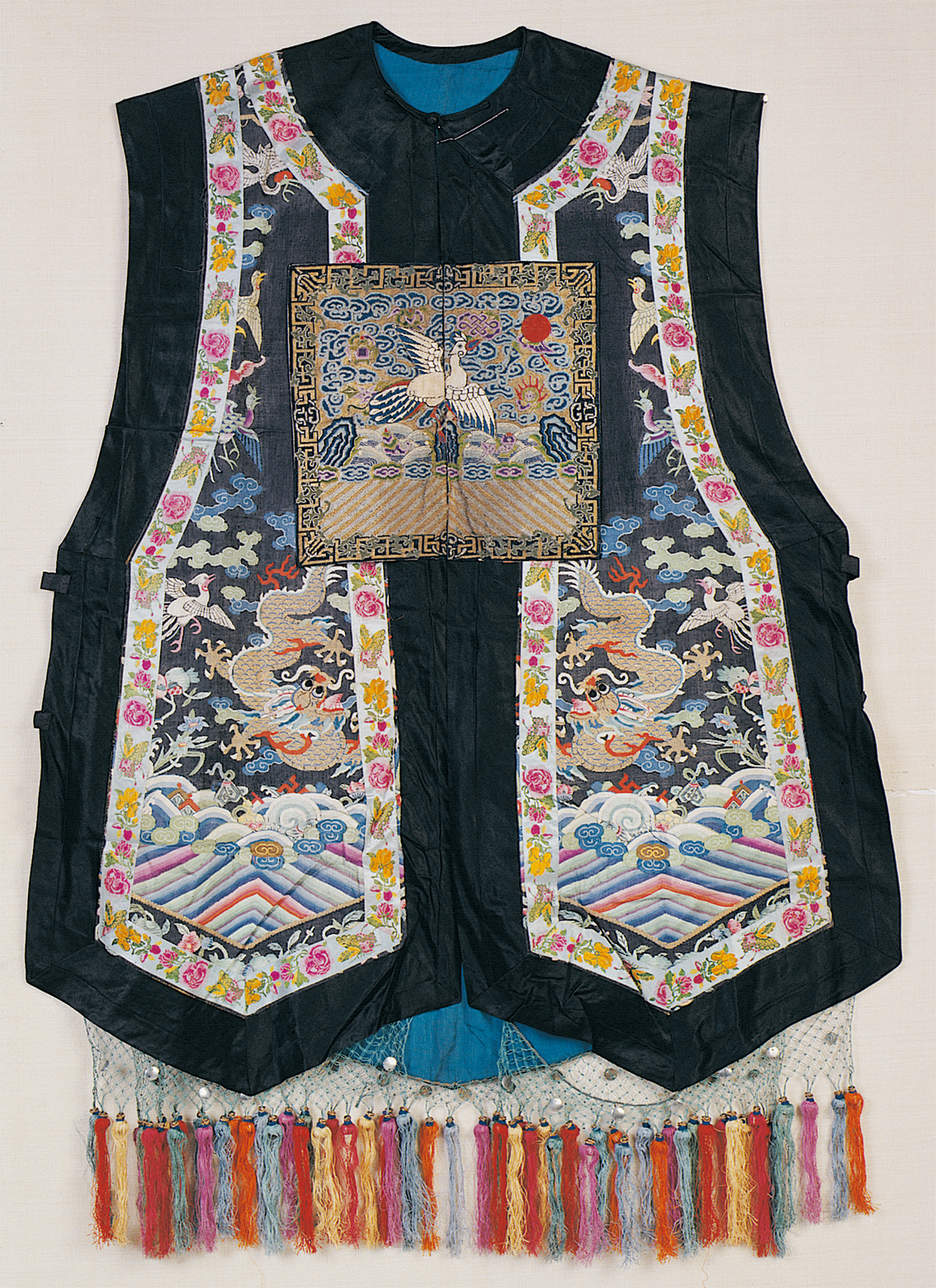 《史記·五帝本紀(jì)》載:“黃帝之前,未有衣裳屋宇。及黃帝造屋宇,制衣服,營(yíng)殯葬,萬(wàn)民故免存亡之難?!痹谖迩Ф嗄昵暗男率鲿r(shí)代仰韶文化時(shí)期,可能就產(chǎn)生了原始的農(nóng)業(yè)和紡織業(yè),開(kāi)始用織成的麻布來(lái)做衣服。據(jù)傳,黃帝之妻嫘祖發(fā)明了飼蠶和絲紡,衣冠服飾基本成制。殷商西周,冠服制度逐漸完善,春秋戰(zhàn)國(guó)時(shí)期,衣冠款式走向多元,冠服制被納入“禮治”范疇,從此漢族衣冠服制更加詳備。中原地區(qū)還出現(xiàn)了胡服戎裝,甚至相沿成風(fēng)(圖為漢族清代七品文官女朝褂,中央民族大學(xué)民族博物館館藏)。
