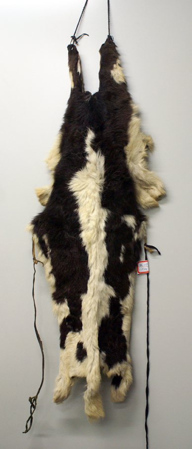 門隅南部地區(qū)的門巴族婦女,不分老少,袍服外披一張較為完整的小牛犢皮或巖羊皮,毛朝內(nèi)、皮板朝外,牛皮頸部朝上,尾部朝下,略做加工、而且四肢皮伸向兩側(cè)。以此為美飾,吉慶節(jié)日或訪親會(huì)友,都要披一張新牛皮做盛裝。傳說,唐代文成公主進(jìn)藏時(shí)背上披著皮子以避邪,后來此物賜給門隅婦女,后此物就成為門巴族婦女歷來沿用的裝束。