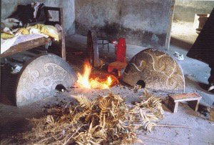 涼山彝族獨(dú)特的“鍋莊石” 。彝族的火塘為全家的生活中心,進(jìn)食、取暖、照明、會(huì)客、議事等都圍著火塘進(jìn)行?!板伹f”由3塊石頭支撐,一般在房屋建成前就請(qǐng)石匠打造好鍋莊石。其石料選取沒(méi)有污垢而又無(wú)缺陷的青石,鑿成厚10厘米左右的變異扇形,上面刻有龍、火、日、月、魚(yú)、鳳等古樸傳神的浮雕圖案。日常生活中,一般在鍋莊“上方”(火塘里側(cè)至墻壁)設(shè)矮床。