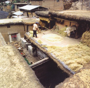 土掌房屋頂 云南楚雄地區(qū)的土掌房,是土墻、土頂、外墻和底層無(wú)窗的兩層樓房。有的內(nèi)院也蓋屋頂,稱(chēng)“無(wú)內(nèi)院式”。設(shè)天窗采光,屋頂還能當(dāng)曬臺(tái)。整個(gè)村落沿山坡而建,巷道很窄,遠(yuǎn)遠(yuǎn)望去,你家的屋頂是他家的院壩,只要上了一家屋頂,就能靠活動(dòng)的木梯自由往來(lái)。