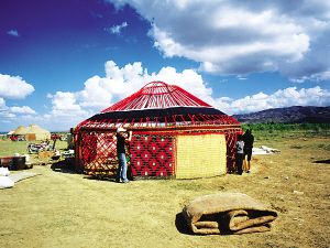 氈房外觀通常樸實(shí)無華,門框由松木做成,上面雕刻花紋或繪制圖案,一塊鮮艷奪目的掛毯吊在門上。房?jī)?nèi)富麗堂皇,布置合理,前半部分堆放日用物品,后半部分待客、住人。