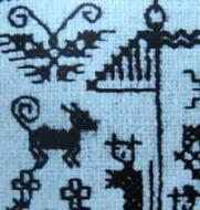 8.畫(huà)繡,分為“簾繡”與“補(bǔ)花繡”兩種。簾繡是在繪好的畫(huà)面上加繡上一層稀疏的細(xì)線,增加一個(gè)層次,表面效果似畫(huà),似繡。補(bǔ)花繡是在繡好的紋樣上加繪局部。