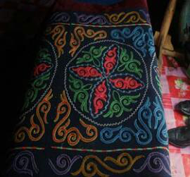 科爾沁刺繡與漢民族刺繡所用底料相比,有自己的特色。漢民族女性喜歡在布料或綢緞上刺繡,特別喜歡軟底的材料。而科爾沁的蒙古族繡女,其刺繡選料更廣一點,除去在軟底料上刺繡外,她們還可以在羊毛氈、皮靴等硬面料上刺繡。在這些硬底料上刺繡,是很費力的,所用的“繡線”也不一般。漢地和南方的刺繡,多用絲線、紗線,金線、銀線、棉線和絨線,為的是色彩豐富,光澤度好,手感也柔軟,不起毛不褪色??茽柷叩拿晒抛宓睦C娘們,用駝絨線、馬鬃或牛筋線等材料,用這些草原上的特殊“繡線”在硬底料(如駝鞍、馬鞍等)上刺繡出的圖案,質(zhì)感極強,猶如浮雕。
