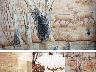 樺樹皮畫是樺樹皮工藝品中重要一種,它從簡(jiǎn)單適用的生活必需品中脫穎而出,成為滿族鄂倫春、鄂溫克、達(dá)斡爾、赫哲等北方狩獵民族精神文化特殊需求的用品。樺樹皮畫是用樺樹皮為繪畫材料,運(yùn)用樺樹皮天然形成的紋理、樹節(jié)為繪畫元素,利用獨(dú)特的繪畫工藝和技術(shù)繪制的以反映游獵民族社會(huì)生活為內(nèi)容,體現(xiàn)游獵民族思鄉(xiāng)情懷的工藝美術(shù)品。樺樹皮畫主要使用揭皮手法和碳化工藝來進(jìn)行創(chuàng)作,崇尚自然和環(huán)保理念。自然古樸、不可復(fù)制、裝飾性強(qiáng)和游獵民族的民族特性,是樺樹皮畫的幾個(gè)突出特點(diǎn)。