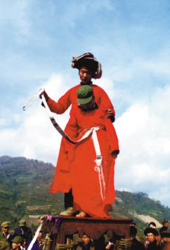 “跳五臺”可算是儀式中較為引人注目的。在村邊的一塊場地中央搭好一座約兩米高的木臺,叫做“五臺”。受戒的弟子們同樣帶著草帽,身穿紅袍,由師父帶領走向五臺。在鑼鼓聲中,繞五臺三圈,繞畢盤腿坐好。師傅叫到誰,誰就起來,在師父的指引下,沿木梯爬上高臺。蹲在五臺上的受戒者,雙手十指交錯,小心翼翼地向后移動到桌邊,然后翻落于藤網之中,由網中的棉被將受戒者包住。師父掀開棉被,見受戒者十指仍然穩(wěn)扣,坐像端端正正,表示度戒成功。十幾位弟子輪番上臺,每位都順利通過。受戒弟子的父母和鄉(xiāng)親們都為他們的成功而歡喜。