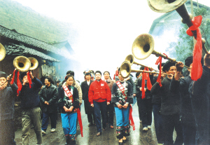 苗族姑娘們,穿鑲花邊衣褲,圍繡花抹裙,扎花絲頭巾,配銀飾花帶,可真叫艷麗。我們這些遠道而來的游客受到熱烈的迎接,姑娘們用古樸的攔門對歌為我們洗塵。攔門地點是在村頭的小橋邊,姑娘們拉著一排民族織錦帶,滿面春風地等待客人,兩邊苗鼓、獅子、嗩吶、甲馬長號夾道歡迎。儀式按苗族風俗,由苗族姑娘們先唱熱情的迎客苗歌,再請客人唱歌作客,對歌三次方過攔門第一關(guān)。緊接著她們又捧出大碗苞谷酒向客人們一一敬酒。熱情好客的姑娘們一定要待客人喝了香醇的美酒后,才示攔門結(jié)束。然后,又一路鞭炮,一路號角吹吹打打,把我們請進苗寨。