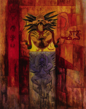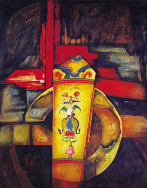 我以前所結(jié)識的一批納西族畫家差不多都是上世紀四五十年代出生的,他們大多接受過美院等高等藝術(shù)院校的教育,具有堅實的繪畫功力,有相同的美學(xué)見解和共同的探索形成的藝術(shù)追求。它一出現(xiàn)就以其獨特的美學(xué)傾向和特殊的藝術(shù)魅力引起世人的關(guān)注。而和向東是上世紀70年代出生的青年畫家,他原來就讀于浙江大學(xué)的藝術(shù)設(shè)計專業(yè),只因迷上美術(shù)學(xué)理論而走上了創(chuàng)作之路,沒有學(xué)院派的背景。他的家鄉(xiāng)云南麗江現(xiàn)在已是聲名鵲起,納西族東巴文化作為世界記憶遺產(chǎn)已聞名海內(nèi)外。作為年輕一代的納西族畫家又該怎么表現(xiàn)東巴文化呢?這個學(xué)藝術(shù)設(shè)計的年輕人以設(shè)計師的獨特眼光和思維,一開始就與“現(xiàn)代東巴繪畫派”的中年畫家群體拉開了距離。其作品在保留古老的東巴繪畫藝術(shù)的基礎(chǔ)上,在作品中運用書寫東巴經(jīng)卷的各種形象和文字符號。用當(dāng)代人的思維觀念和審美意識,運用油畫的技法來表達。畫面大多用平面設(shè)計的構(gòu)成原理,以裝飾性的、形式感極強的、既寫實又抽象的手法表現(xiàn)出原汁原味的納西文化。即使拋開作品主題內(nèi)涵,依然可以從他的作品里感受到一種神秘、古樸、深沉的歷史基調(diào)。因4年前他的創(chuàng)作是在平面設(shè)計為主的業(yè)余時間里完成的,而真正投入精力進行專業(yè)創(chuàng)作是近兩年的事,因此,他現(xiàn)在處于學(xué)習(xí)、吸收、探索創(chuàng)作的過程中。