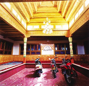 和田的“阿以旺”民居。和田地處塔克拉瑪干沙漠的南部,冬冷夏熱,干旱少雨風(fēng)又大,蒸發(fā)量是降雨量的幾十倍。為了適應(yīng)氣候,維吾爾人創(chuàng)造了平頂土房,房?jī)?nèi)居室分冬室和夏室兩部分。在維語(yǔ)中,“夏室”又稱“阿以旺”,建筑前面的外廊,其地面高出院落地面近一米,形如土炕,鋪氈毯,是每年5 ~ 11月份日常生活、待客的主要場(chǎng)所,晚間鋪被褥即可睡覺(jué)。設(shè)天窗側(cè)向采光