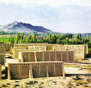 吐魯番曬葡萄干的“陰房”。這里處于我國(guó)海拔最低的盆地,也是維吾爾族聚居區(qū),冬冷夏熱,民居既要防寒又要防暑。吐魯番盛產(chǎn)葡萄,每戶皆有曬葡萄干的陰房,因此,住房與陰房合一的民居成了吐魯番的特色。大的陰房都集中建在山坡上,以利運(yùn)輸,小的陰房