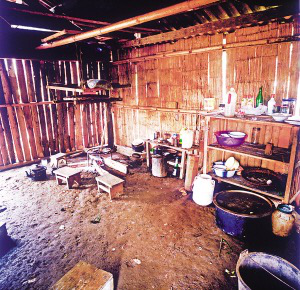 房內(nèi)一般隔成里外兩間,里間狹小,光線暗,是主人的臥室,只放雙人床和一小部分生活用品。外間寬大,是生火煮飯、聚會(huì)待客和子女就寢的地方。火塘設(shè)在里間屋的門外,放鐵制三腳架,三腳架對應(yīng)的方位有固定的用途,即靠里間房門一方為主人的座位,靠外間房門一方為客人的座位,火塘上方靠墻處為子女的床位。如有成年子女和新婚夫婦,則在外間再隔出小間,里間和外間存放著生產(chǎn)用具和酒具。房內(nèi)幾乎沒有什么家具和裝飾性的陳設(shè),有的甚至沒有桌椅和床鋪,只在火塘周圍鋪著竹席或木板,合衣向火而眠?;鹛辽厦?米多高處懸掛著竹編的約1米見方的架子,上面放著食具、鹽巴、辣椒等,也是烘烤牛肉干的地方。架子上面靠房頂處并排放著幾個(gè)粗大的竹筒,里面存放糧食。這幾年的新村民居,在保持傳統(tǒng)民居特征的前提下使用了新型建材,更堅(jiān)固,更舒適。