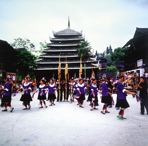 侗寨鼓樓前的表演。侗家把鼓樓當(dāng)做遮蔭樹,既是侗寨的象征,也是氏族的標(biāo)志。因此,所有鼓樓都是全寨人集資、出力興建的,大一點的村寨按居住范圍會建幾座鼓樓。