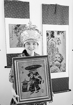 一幅幅人物肖像、書法作品、風(fēng)景風(fēng)情畫,工藝精細(xì),造型典雅,誰(shuí)能想到,它們出自一群苗家留守婦女之手?