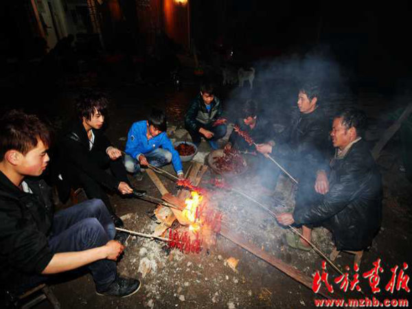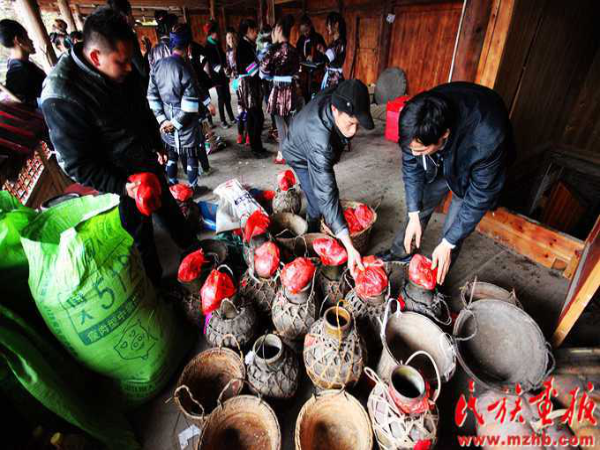 這次結(jié)婚的共有15對新人(多時有二三十對),均來自本寨的青年男女?;槎Y從大年二十六開始,共進行三天,在三天的婚禮中新郎新娘家均有婚宴,尤以第一天中午的規(guī)模最大也最為隆重。
