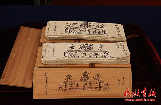 捐贈(zèng)的部分東巴經(jīng)手抄本,經(jīng)書由納西族地區(qū)的35名東巴歷時(shí)29個(gè)月完成。經(jīng)書的卷名、題名及經(jīng)文提要漢文部分由納西族書法家許烈雄書寫,封面夾板的東巴文部分由納西族新一代東巴木琛書寫
