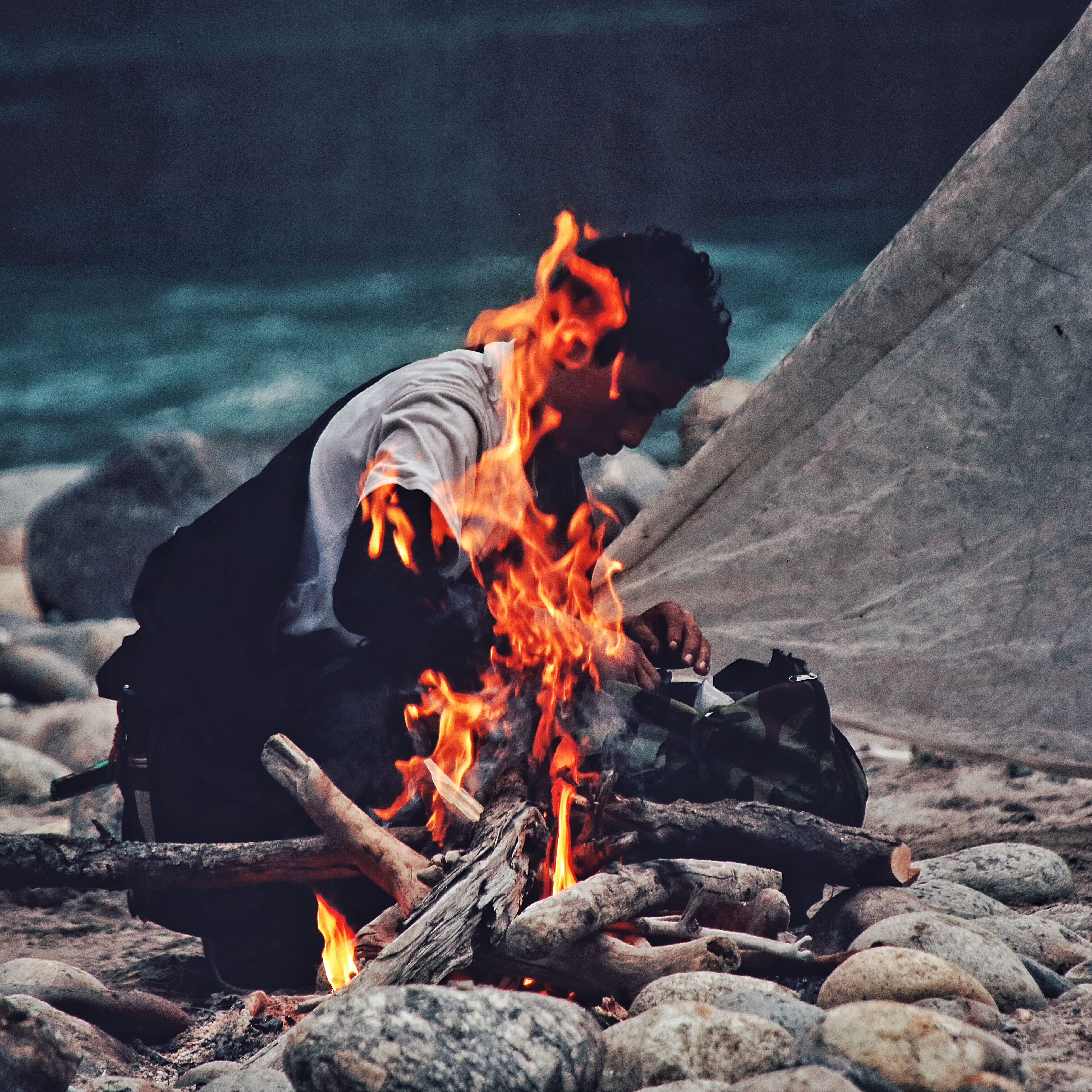 圖片說(shuō)明:在河邊扎營(yíng)的放映員
