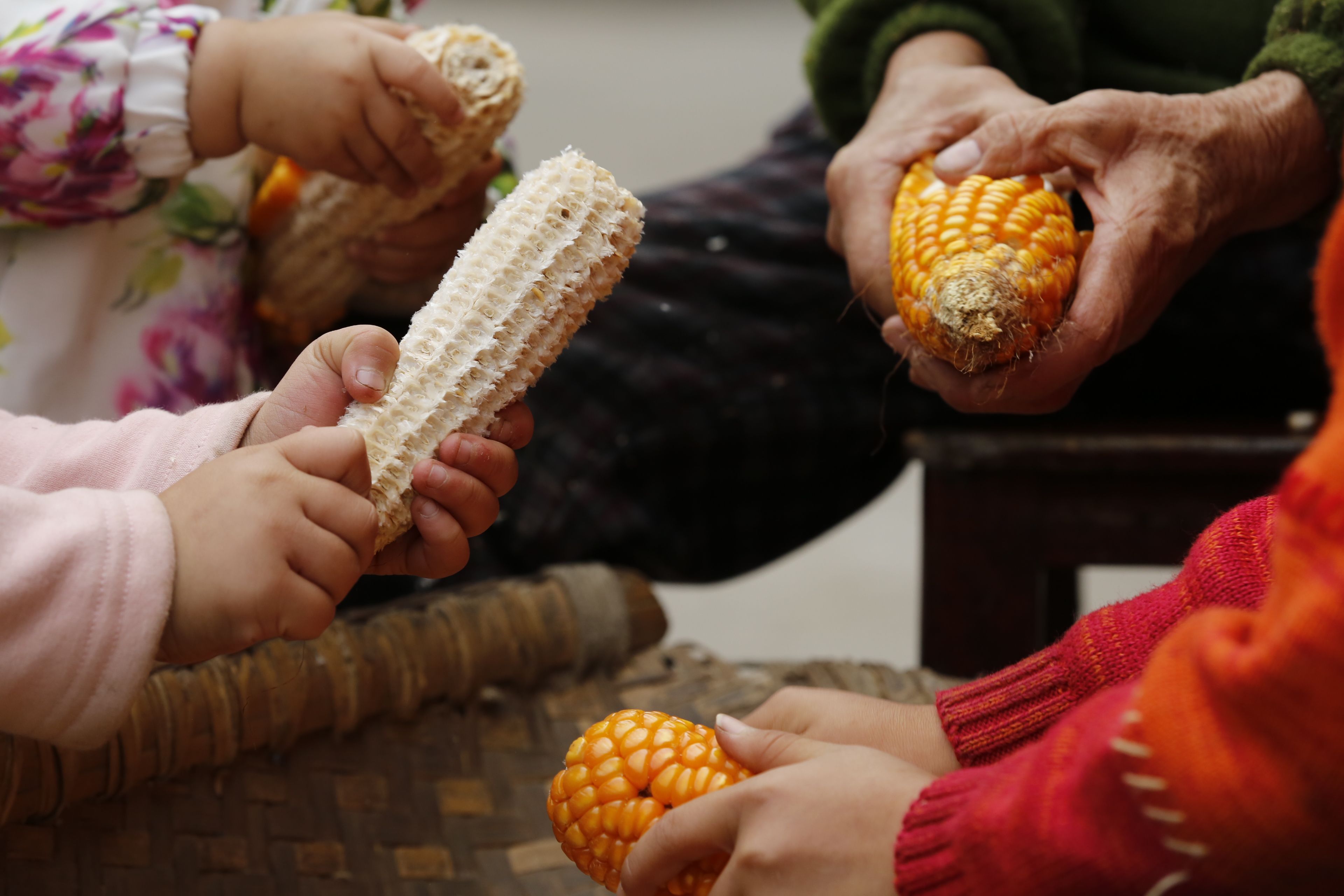 貴州貴陽(yáng)苗族老年人與兒童剝玉米