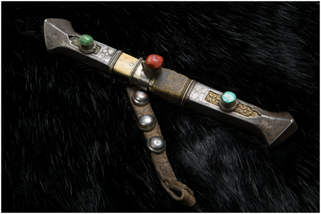 安多地區(qū)主要以放牧為主,牧民的刀主要用于宰殺和吃肉,有嚴格的男用女用之分,男式刀長度在一尺以上,女式刀在一乍左右,刀鞘的底部和刀柄的末端上翹,呈船形。安多人喜歡珠寶,頭飾、胸飾、腰飾無不光燦耀人,這些飾物同樣被用在刀上,刀鞘和刀柄錨金錯銀,鑲嵌著珊瑚和綠松石,像精美的藝術品。