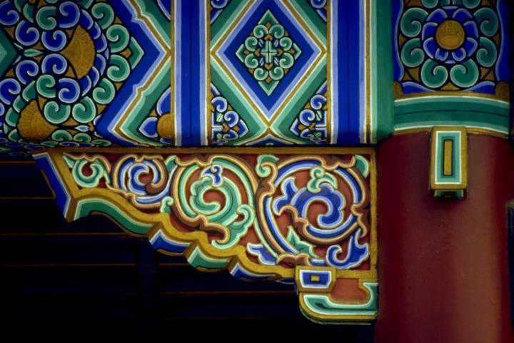 傳統(tǒng)彩畫是程式化的圖案,其設色有一定的規(guī)律。一般以明間為基點、上青下綠、青綠相間為原則。水平方向是:明間上青下綠,次間上綠下青,再次間又是上青下綠,以此類推。和璽彩畫、旋子彩畫和蘇式彩畫的設色規(guī)律基本相似,新式彩畫則沒有固定的設色規(guī)定。