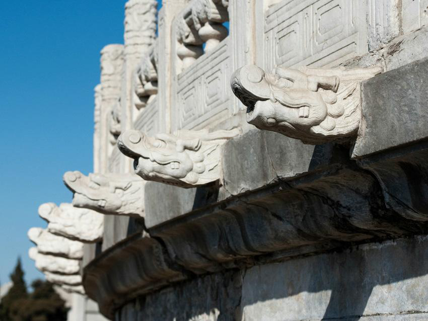 北京天壇祈年殿有三層月臺(tái),第一層月臺(tái)上的排水構(gòu)件是云頭,第二層的是鳳頭,第三層則是龍頭,這個(gè)龍頭就是螭首(chī shǒu)。同樣,故宮太和殿龍鳳云紋的望柱下就有排水螭首1142只,可以想見(jiàn)當(dāng)大雨滂沱之時(shí),螭首千龍吐水是何等壯觀的場(chǎng)面。