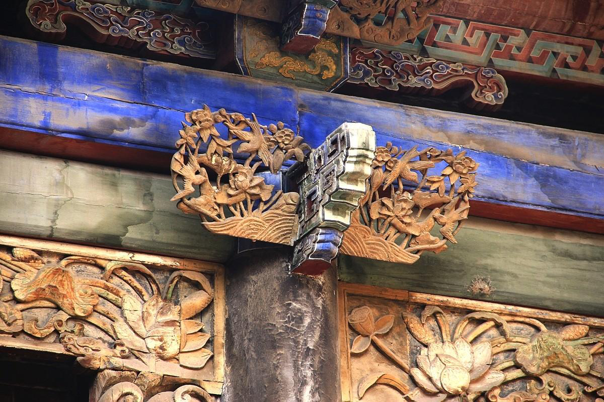 正廳大門(mén)之上的門(mén)楣,是一塊精美絕倫的木雕,采用雕、嵌、描、繪等多種裝飾技法,將喜鵲鬧春的場(chǎng)景表達(dá)得惟妙惟肖,具有極高的藝術(shù)價(jià)值;除了雕刻著代表中國(guó)傳統(tǒng)文化精神的梅蘭竹菊外,許多地方的門(mén)窗,尤其是專(zhuān)供男孩子們讀書(shū)的庭院中的窗子,都雕成簡(jiǎn)潔古樸的書(shū)本或折扇的形狀,表達(dá)了“萬(wàn)般皆下品,唯有讀書(shū)高”的文化追求。