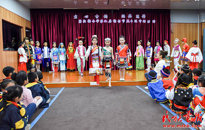 同一天下午,一場精彩的T臺秀在上海市閔行區(qū)梅隴鎮(zhèn)弘梅小學(xué)上演。小學(xué)生們身著民族服裝亮相,動感的音樂、精彩的表演,將“民族團結(jié)一家親”的理念演繹得生動活潑。學(xué)校布置的民族文化墻上,展示了我國56個民族的風(fēng)土人情,營造了多姿多彩的民族文化氛圍,讓民族特色文化陪伴在學(xué)生身邊。