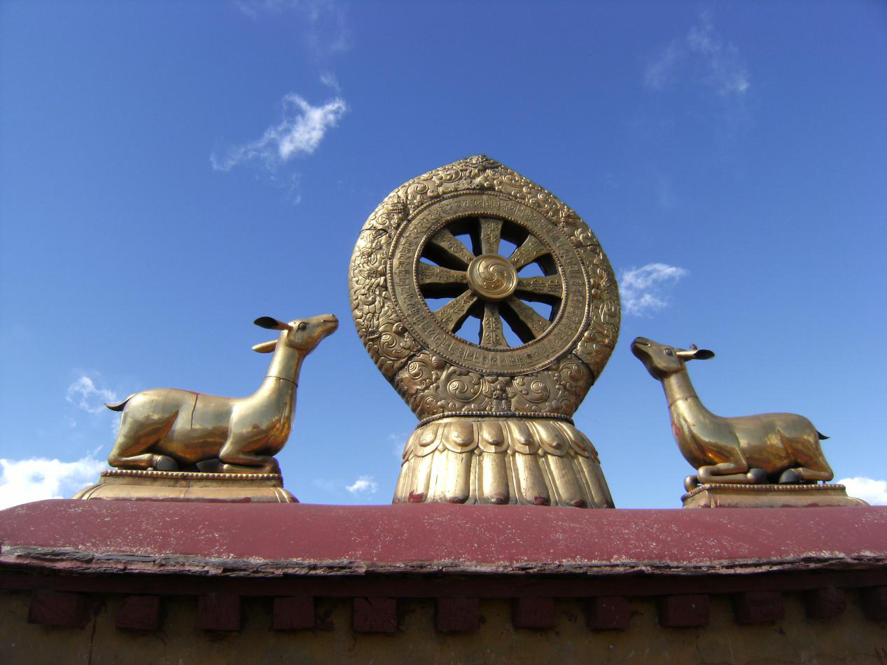 全寺坐東朝西,建筑具唐代風(fēng)格,有高四層的銅質(zhì)鎦金樓閣五座、殿堂數(shù)十間。正殿供奉文成公主從長(zhǎng)安帶往的釋迦牟尼像,像前擺放十二盞金燈。各殿有松贊干布、文成公主、墀尊公主的塑像及佛像、祖師塑像,還有壁畫眾多。珍藏有七世紀(jì)以來的歷代文物。