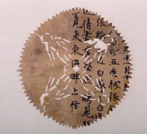 考古人員在阿斯塔那墓葬中還發(fā)現(xiàn)了兩種不同的人形剪紙,一種是剪成并排而立的7人形狀,近似泥俑;另一種在一張寫有文字的圓形紙上,剪刻了4個(gè)站立著的人形紋。這兩種人形剪紙?jiān)煨秃啙崳瑘D案清晰,充滿濃郁的生活氣息。