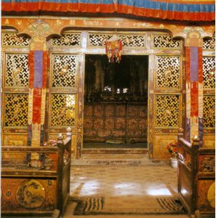 大門由于它的位置所在不應(yīng)該列入室內(nèi)裝飾,但它與室內(nèi)裝飾息息相關(guān),連成一體,故我們把它當(dāng)作室內(nèi)裝飾在這兒加以介紹。門框裝飾包含門框本身、門楣、門楣上的屋檐、門板等。藏族建筑大門裝飾十分講究,從屋檐到門坎都用雕、繪的手段充分加以裝飾。屋檐用兩道方本間隔排列,上蓋青石片和黃土筑成底小頭大的形狀,它不僅有美觀的裝飾效果,而且起到防水作用。屋檐下是門楣,門楣上彩繪各種圖案,門框的木構(gòu)件上雕刻蓮花花瓣和累卷疊函凹凸方格圖案,這種圖案處理形式大部分民居大門大同小異。門板為單開式,板門為了加固起見上、下分層釘鐵條。門板一般涂單一色,不作繪畫處理。除了這些裝飾以外,門相上掛短縐簾,門框左右邊緣墻上涂?jī)傻篮谏Q條,每年過年前短縐簾要棄舊換新,黑色豎條與粉刷外墻一道重新涂漆,這是一般民居門框裝飾。寺廟門框裝飾較為復(fù)雜,門楣的間隔方木上加一層雕刻動(dòng)物頭像的木雕作品排成一行,裝飾門楣這一板塊,門框木構(gòu)件多則六、七層,層層雕刻各種圖案,可見其講究程度。寺廟門板大多是對(duì)開式,用鐵條包裝門邊緣,中間分層釘鐵條,涂一層單一的顏色,特殊殿堂如擴(kuò)法神殿大門門板上要進(jìn)行繪畫處理,寺廟大門講究厚重、莊嚴(yán)。無論是民居大門還是寺廟大門,其裝飾要求與室內(nèi)梁柱裝飾相協(xié)調(diào),從顏色的運(yùn)用到雕刻內(nèi)容都要做到這一點(diǎn),保持內(nèi)外裝飾效果統(tǒng)一。