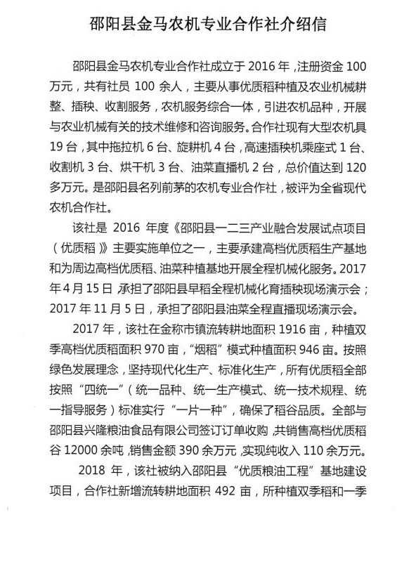 在農(nóng)機專業(yè)合作社的幫助下,當?shù)剞r(nóng)業(yè)生產(chǎn)過程的機械化程度非常高。邵陽縣金馬農(nóng)機專業(yè)合作社,位于邵陽縣金稱市鎮(zhèn)石馬村,主要提供組織農(nóng)業(yè)機械耕整、插秧、收割服務,大大提高了當?shù)氐姆N植和生產(chǎn)效率。