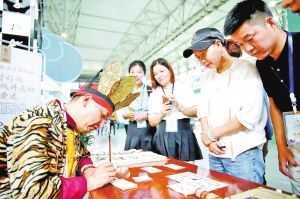 在云南文博會(huì)上,來(lái)自麗江的納西族東巴文化傳承人現(xiàn)場(chǎng)展示東巴文字的書(shū)寫(xiě)方法。 張彤?dāng)z