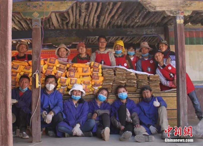 西藏自治區(qū)古籍保護(hù)中心工作人員和大學(xué)生志愿者整理古籍后合影。受訪者供圖。