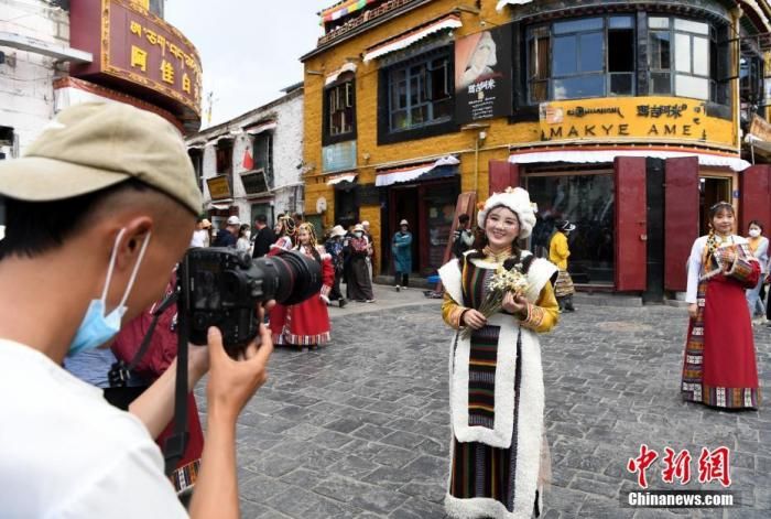 圖為7月24日,游客穿上藏族傳統(tǒng)服飾在拉薩市八廓街拍照留念。 中新社記者 貢嘎來松 攝