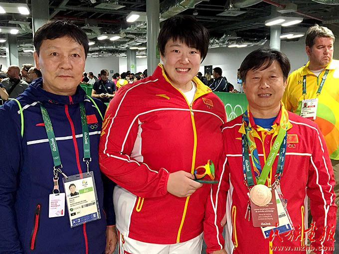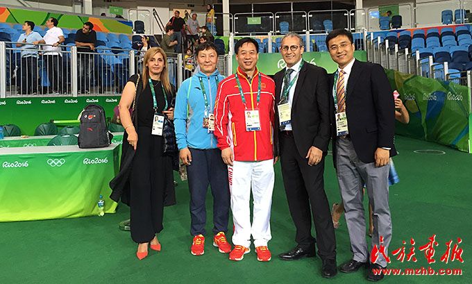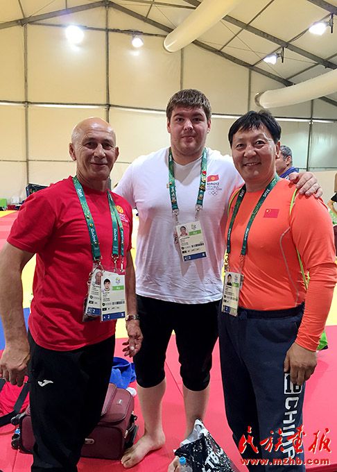 2016年,里約奧運(yùn)會期間,烏日根桑格(左)與中國國家柔道隊隊員于頌(中)、國家柔道隊原主教練程志山合影留念。
