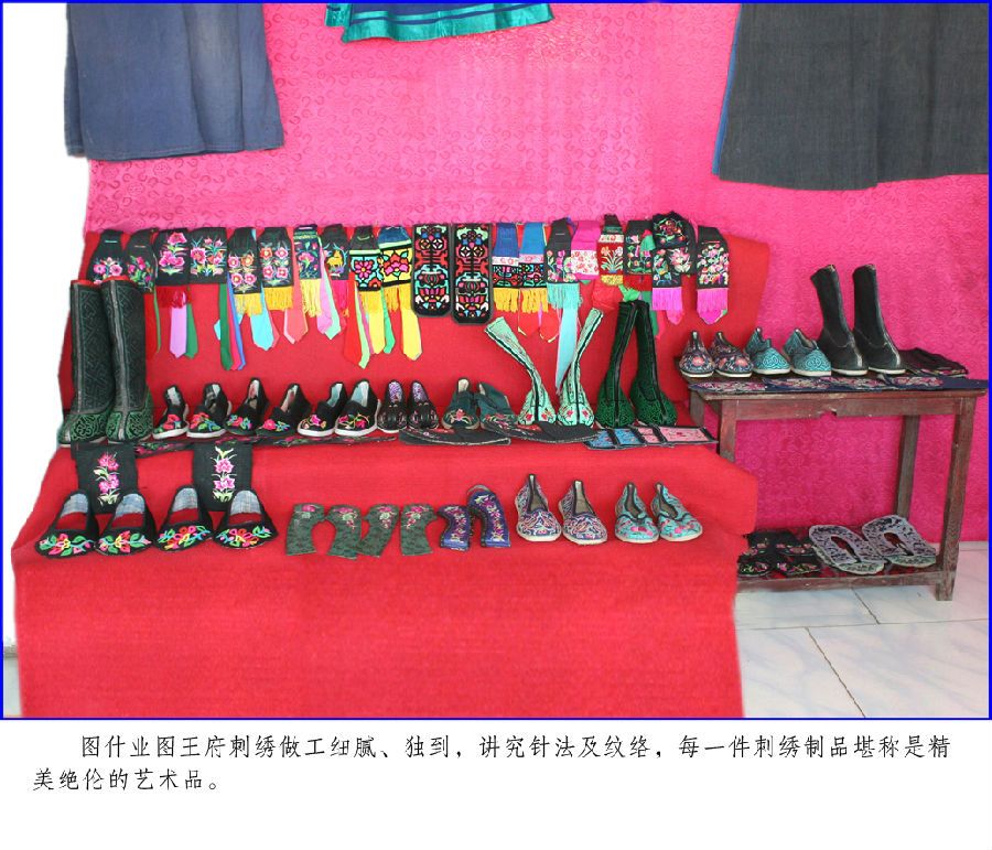 圖什業(yè)圖王府服飾包括:服裝、服飾、鞋帽及馬匹裝飾等。或質(zhì)樸、清新,或漂亮、華貴,或錯(cuò)落有致;既有山水,又有花鳥,形象逼真,惟妙惟肖,色彩協(xié)調(diào),圖案精美;其做工細(xì)膩獨(dú)到,講究針法及紋路,每一件服飾制品堪稱是精美別致的藝術(shù)品。