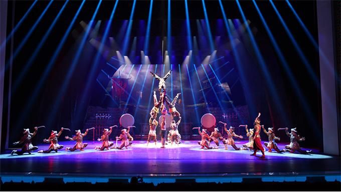 雜技是這部劇的一大亮點。新疆生產(chǎn)建設兵團雜技團近年來編創(chuàng)了《天鵝湖—男子倒立技巧》《向太陽—繩技》《春之韻—女子造型》等多個精品節(jié)目,并在國內(nèi)外重大雜技賽場多次獲獎?!稑翘m尋夢》中,主創(chuàng)團隊將這些獲獎節(jié)目進行拆解,將蹬鼓、獨輪車、吊環(huán)、肩上芭蕾、水流星及舞中幡等雜技技巧與戲劇元素相融合,讓觀眾猶如置身于黃沙漫漫的絲路古國。