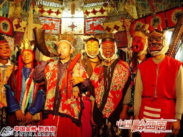 生活在黔西南州貞豐、晴隆、普安、望漠、冊亨、安龍、興義等8縣市的20萬苗族同胞的先民,在遠古時代“信鬼不信神”,認為人的靈魂不滅,祖先死后靈魂仍在,可以保佑子孫后代。因此,苗族先民往往祈求祖先,助其實現(xiàn)心愿,一但酬愿便要祭祀祖先,俗稱“還儺愿”。還愿時舉行的儀式就是儺儀。還儺愿主要由苗巫師主持,跳儺時配以唱、念及動作,儀式非常莊嚴(yán)肅穆。明末清初民間藝人開始將“還儺愿”的部分內(nèi)容整理、加工、完善后搬上舞臺,便成了儺戲。因此說,儺戲是從莊嚴(yán)的祭祖儀式脫胎而成的一種獨具特色的地方曲目。儺戲沒有管弦樂,但有節(jié)奏明快的鑼鼓伴奏,曲調(diào)流暢悅耳,劇情風(fēng)趣詼諧,更具有濃郁神秘的苗族文化色彩,深受苗族同胞的喜愛。