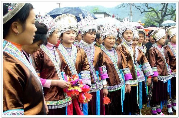 香粉古龍坡會于每年農(nóng)歷正月十六舉行,所以又名“十六”坡。這一天、來自外國朋友、各地的游客及當(dāng)?shù)胤綀A十里的苗哥苗妹,提蘆笙,提鳥籠、牽馬匹,打花傘……朝著十六坡趕來。正午時(shí)分,山梁上、村道間、河溪旁,出現(xiàn)了成列成隊(duì)穿紅戴綠的人群。遠(yuǎn)遠(yuǎn)望去,似一條彩帶在飄動。當(dāng)萬余人匯集后,整個(gè)坡地就成了彩色的世界。