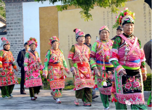 男子頭頂氈帽(又稱氈窩),穿大襟衣、大襠褲,赤足或穿草鞋,披羊皮,外出背皮袋(現(xiàn)已基本消失)。女子裹高包頭、額上飾銀桂花,衣為布襟,外套坎肩,腰系大圍腰,大圍腰左右下三邊繡五色花,為動(dòng)植物圖案,足穿繡花鳳頭鞋,用本地產(chǎn)綠布條制褲子,不鎖腳邊,腰間背圓形白氈裹背,所穿服飾顏色鮮艷、質(zhì)地厚重,盡顯遠(yuǎn)古南詔皇室服飾遺風(fēng)。