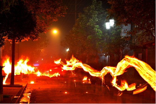 不到黃昏,鞭炮聲就響起來了。新生兒的父親點燃火把后,孩子們迫不及待地拿著小火把和松明粉,跑來跑去燒新生兒的的各種親戚,大人們樂呵呵地接受孩子們噴灑過來的火焰,并一致說著很吉祥的祈愿祝福語?!皬拇嘶逇獠辉趪D!”、“一年更比一年好呀!”、“紅紅火火又一年”。男女老少在火把樹下吃喝玩樂,其樂融融。糖、炒蠶豆、梨、蘋果等被大家傳來傳去,新生父親挨個向親友敬酒。親友鄰居喝著喜酒,一致祝福新生兒安康成長,將來富貴吉祥。
