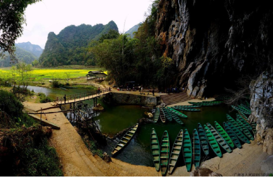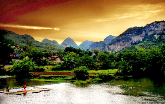 壩美,為壯語譯漢語為:壩—沖口,美—樹 ,因居住的沖口樹木多而得名。壩美村位于珠江流域西江水系馱娘江上游的阿科河畔。屬喀斯特地貌,區(qū)域內(nèi)山峰奇特,河谷幽美,阡陌縱橫,河流山泉蜿蜒奔流,溶洞層疊散布在山體峰內(nèi),冬無嚴寒,夏不酷暑,氣候宜人。因四面環(huán)山,不通公路,進出寨子主要靠村前村后兩個天然的石灰溶巖水洞,村民們要摸著巖壁趟水、撐竹筏、劃獨木舟、坐小船,經(jīng)過950米長的幽暗的“出水洞”和680米長的“湯拿洞”才能進出。由于地處偏僻,交通不便,基本不與外界交往,多年來壩美村長時期與外世隔絕。壩美村水源豐富,氣候溫和,自然生態(tài)環(huán)境未被污染,負氧離子質(zhì)數(shù)高出城市數(shù)倍,游人在此休憩,心曠神怡,是一個溫濕潤,四季宜人的旅游勝地。就生態(tài)環(huán)境和歷史淵源來說,《桃花源記》問世1500多年,只聞其名,不見其實。相傳除唐代確認湖南省桃源縣的桃源洞為其原型外,目前全國就有冠名“世外桃源”的地名16個之多。而今天的壩美,不僅十分相似,而且還神似東晉文學家陶淵明筆下所描寫的“林盡水源,便得一山。山有小口,仿佛若有光;便舍船從口入……土地平曠,屋舍儼然,有良田美池桑竹之屬;阡陌交通,雞犬相聞……”的世外桃源。而且在當?shù)卮迕裰杏性S多歷史傳說:北宋皇祐四年(公元1052年),壯族起義領袖儂智高在邕州(南寧)昆侖關被狄青打敗后,退入以其繼父儂夏卿為首領的特磨道(廣南)后,至和二年(1055年),宋朝廷又派楊文廣領兵進剿,儂智高在突出重圍轉(zhuǎn)至阿科(今廣南縣壩美鎮(zhèn)治所)與宋軍周旋,終因寡不敵眾而離開阿科轉(zhuǎn)戰(zhàn)于丘北、開遠、蒙自、元江等地,后到大理不知所終。